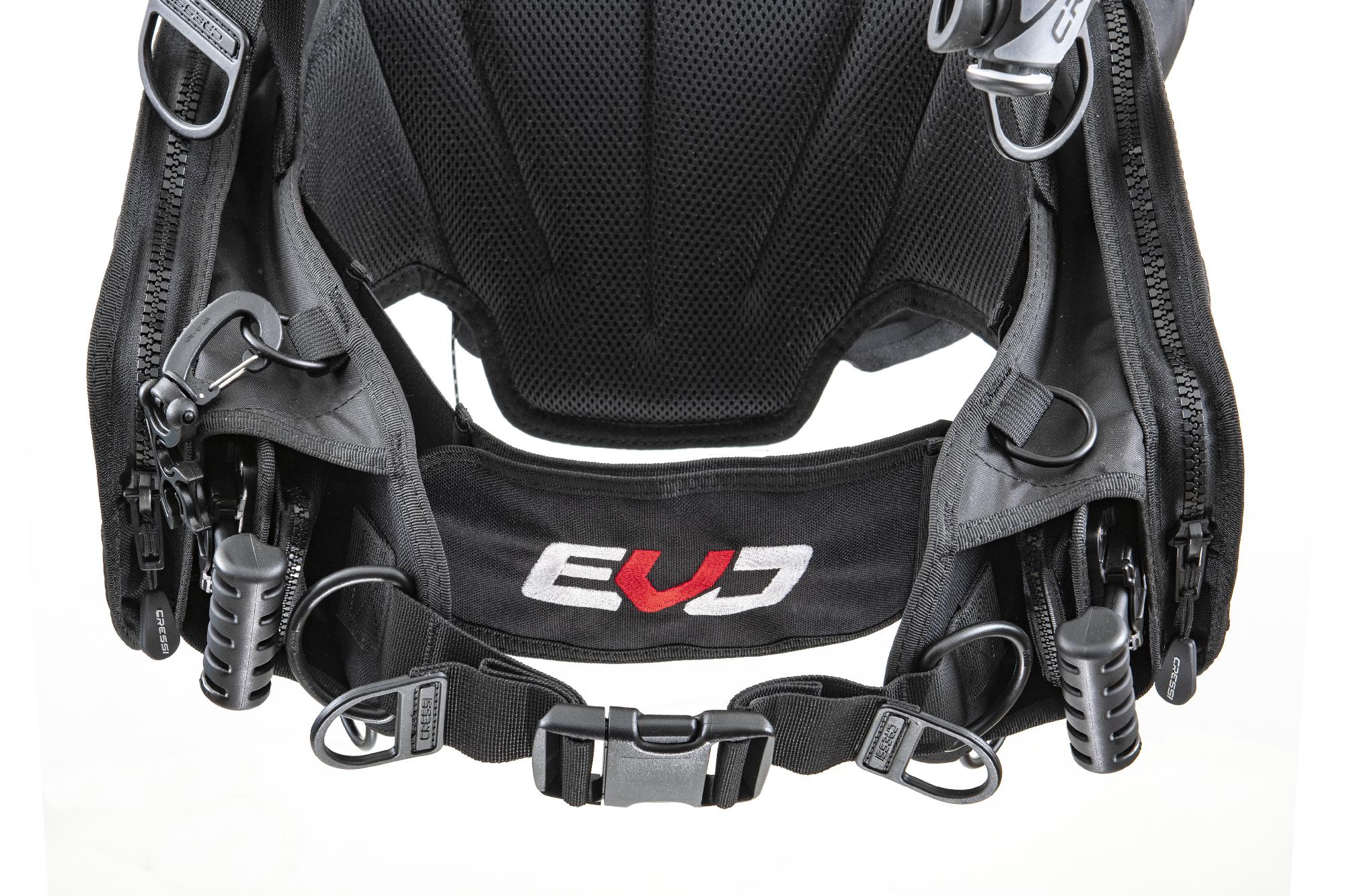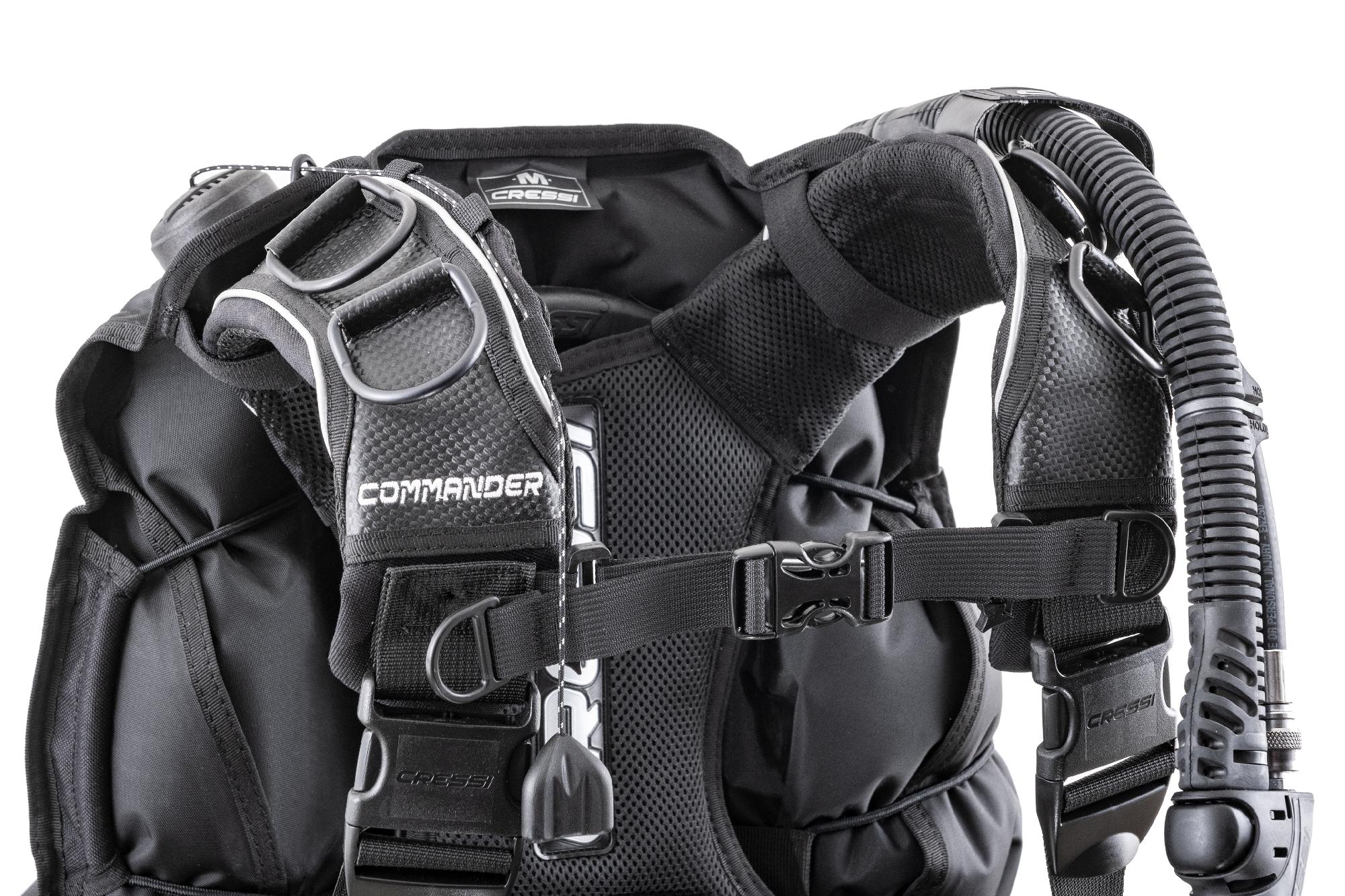Además, el Commander Evo cuenta con anillas D de acero inoxidable, válvulas de sobrepresión con tiradores, y un inflador ergonómico con latiguillo flexible, que aseguran un control preciso del aire y la flotabilidad.