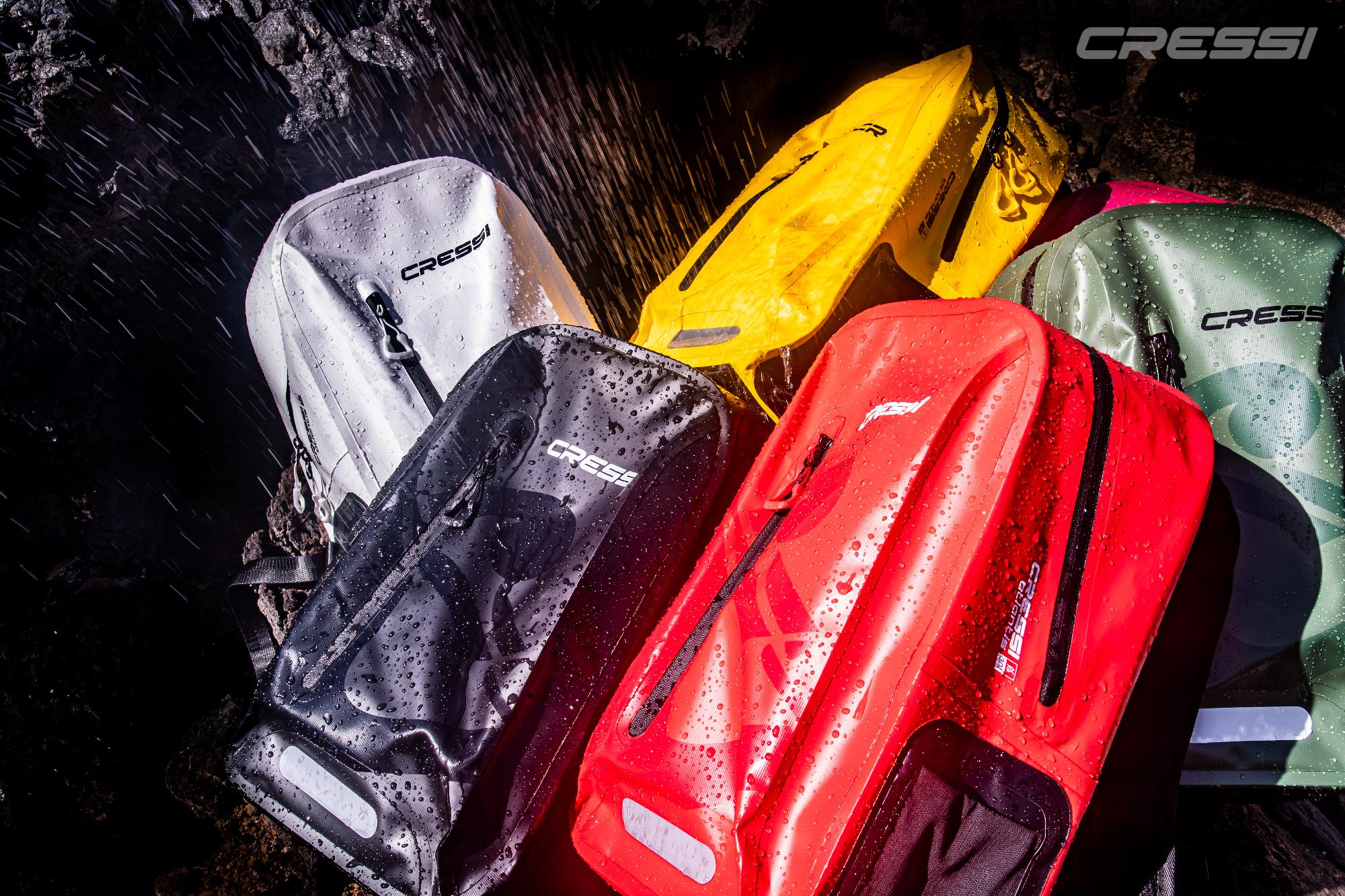 La mochila Atlantis Dry de Cressi ha sido diseñada como una mochila todoterreno 100 % impermeable. Su cuerpo está confeccionado en tejido tarpaulín resistente y flexible, con costuras completamente termoselladas y cremalleras impermeables de alta calidad, para garantizar protección frente a agua, arena, sal y humedad. La mochila tiene unas dimensiones de aproximadamente 46 × 32 × 18,5 cm (alto × ancho × fondo), un volumen de 30 litros y un peso ligero de aproximadamente 980 g.