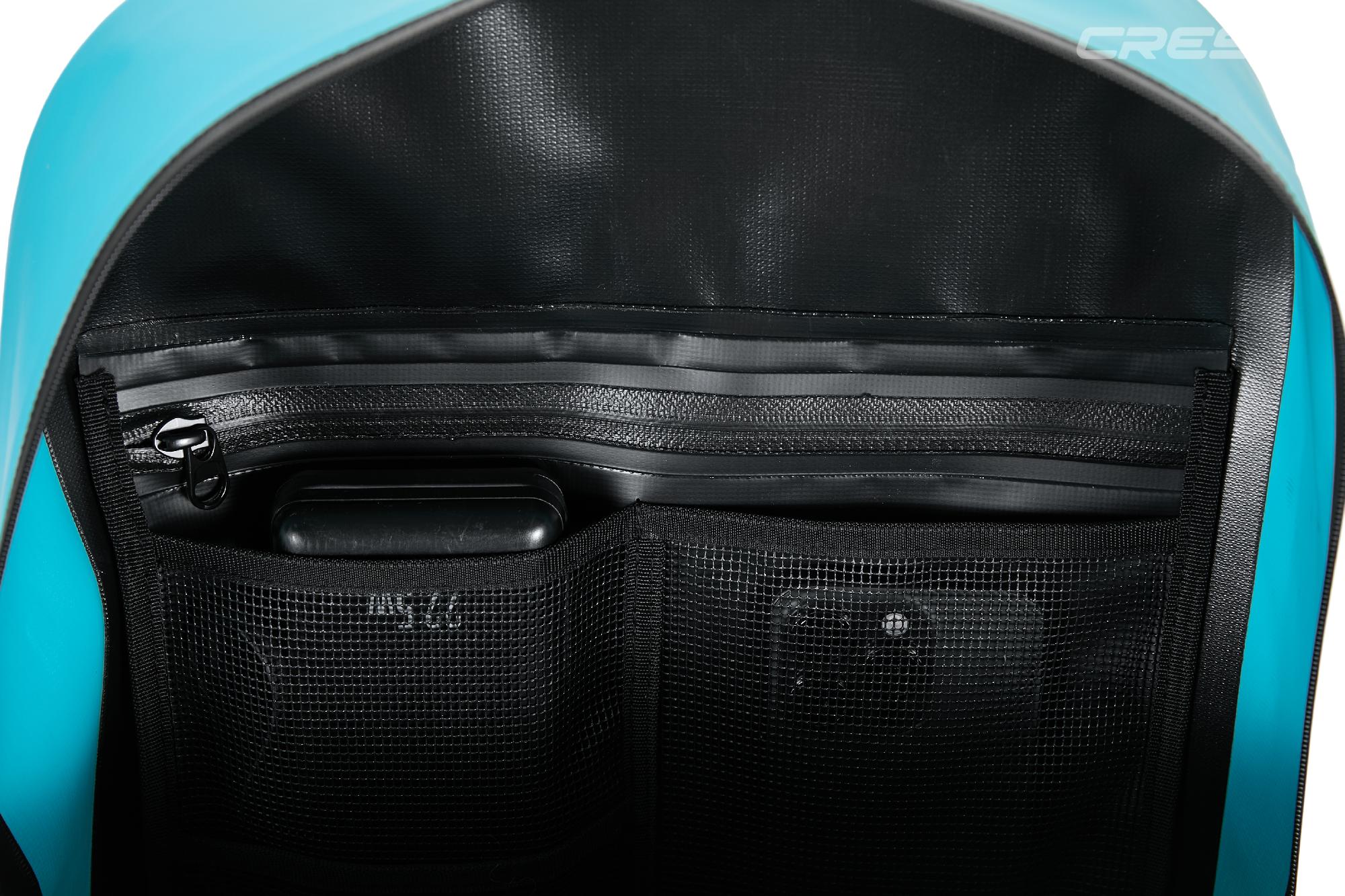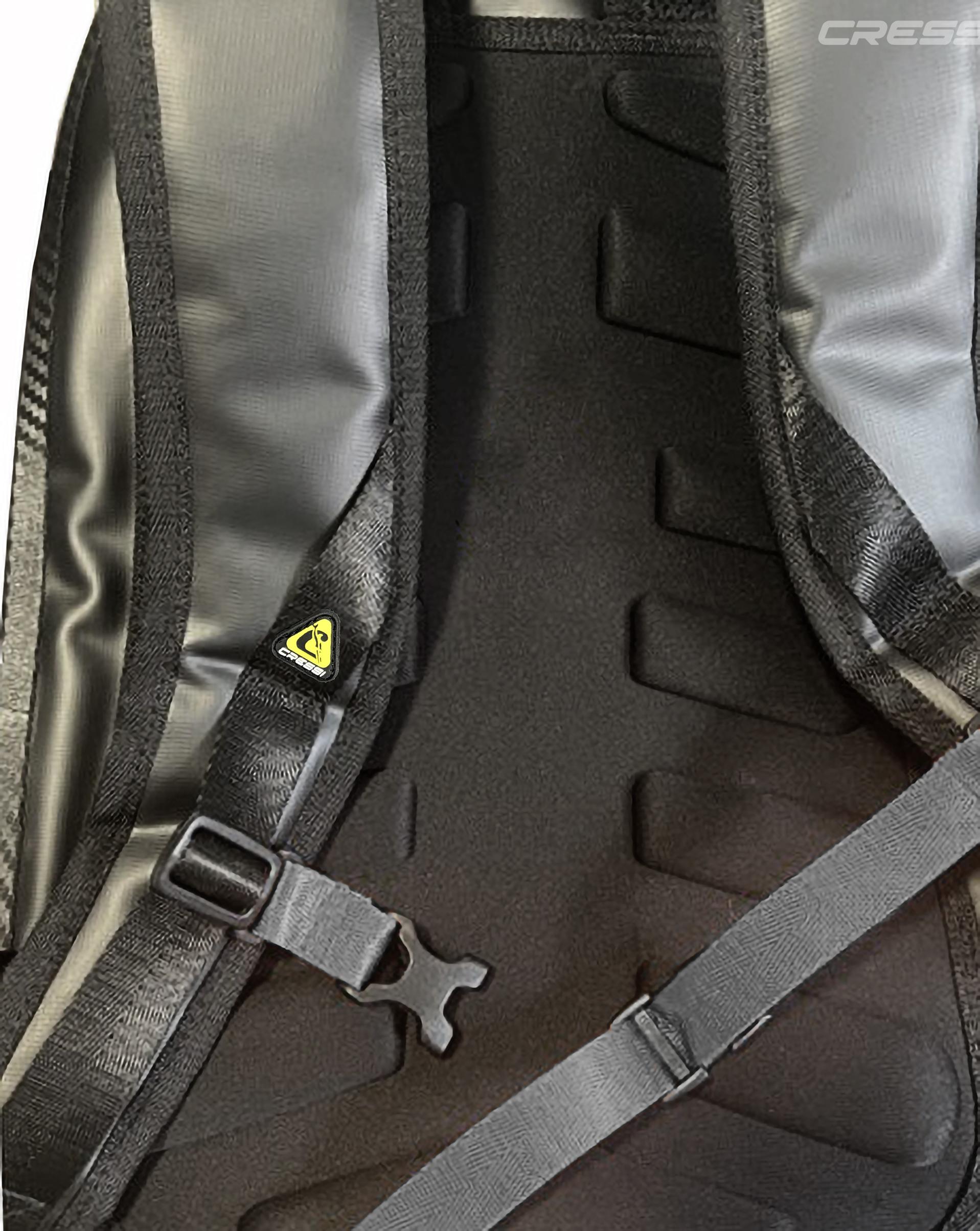 El arnés es anatómico, completamente ajustable, y dispone de respaldo acolchado termoformado que asegura comodidad incluso durante uso prolongado. Incluye cincha pectoral regulable en altura para mejorar el ajuste. En el frente incorpora un bolsillo con cremallera estanca para objetos de valor, y en ambos laterales dispone de bolsillos de malla elástica para transportar botellas u otros elementos de fácil acceso. En el interior, cuenta con un bolsillo estanco con cremallera y tres compartimentos para mejor organización. El fondo está reforzado y acolchado para resistir el desgaste al apoyarse o deslizarse, y los tiradores de las cremalleras son personalizados Cressi. Además, en la parte inferior frontal incorpora un panel reflectante para aumentar la visibilidad en condiciones de escasa luz o anochecer.